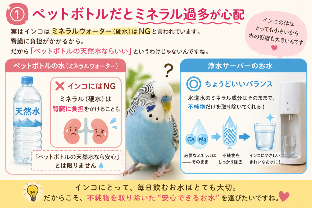 実はインコは ミネラルウォーター(硬水)はNG と言われています。腎臓に負担がかかるから。だから「ペットボトルの天然水ならいい」というわけじゃないんですね。