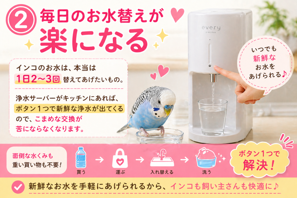 インコのお水は、本当は1日2~3回替えてあげたいもの。浄水サーバーがキッチンにあれば、ボタン1つで新鮮な浄水が出てくるので、こまめな交換が苦にならなくなります。