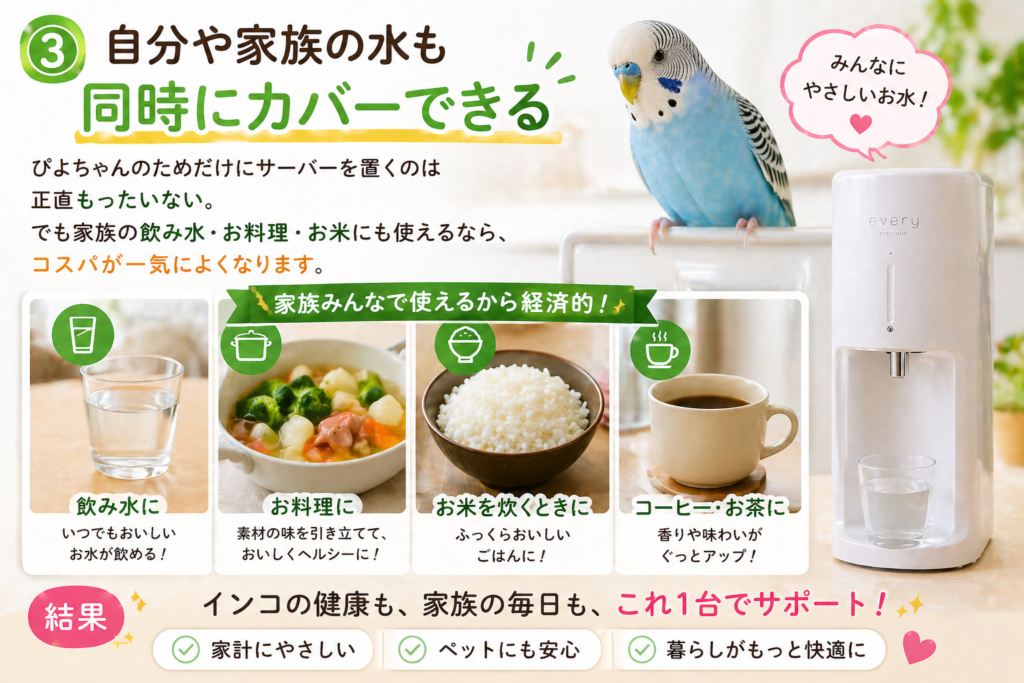 ぴよちゃんのためだけにサーバーを置くのは正直もったいない。でも家族の飲み水・お料理・お米ときにも使えるなら、コスパが一気によくなります。