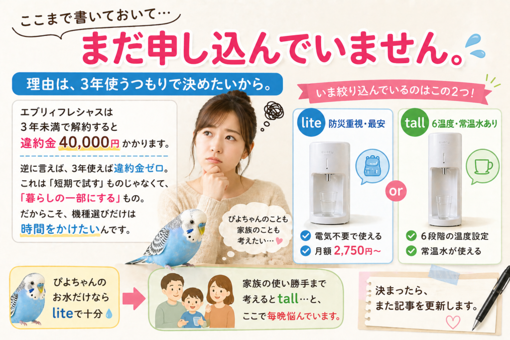 いま絞り込んでいるのは、lite(防災重視・最安)か、tall(6温度・常温水あり)。ぴよちゃんのお水だけならliteで十分だけど、家族の使い勝手まで考えるとtall…と、ここで毎晚悩んでいます。