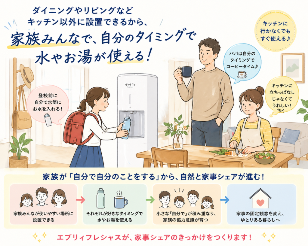 リビングやダイニングに設置でき、家族それぞれが好きなタイミングで水やお湯を使えるのが特長。子どもが自分で水筒を準備したり、パパが気軽にコーヒーを楽しんだりと、自然に家事シェアが進みます。
