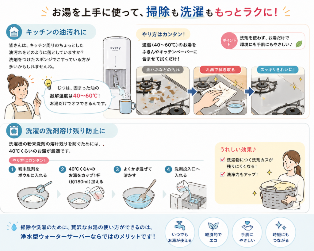 40〜60℃のお湯で油汚れは簡単にオフ。さらに洗濯でもお湯で洗剤を溶かすことで洗浄力アップ&溶け残り防止に。掃除・洗濯にお湯を手軽に使えるのが魅力です。