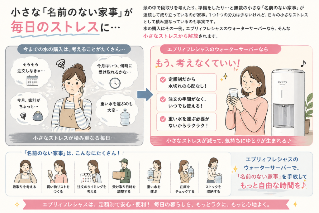 「名前のない家事」を減らし、注文や受け取りの手間をカット。定額制で水切れの心配もなく、日々の小さなストレスを軽減します。