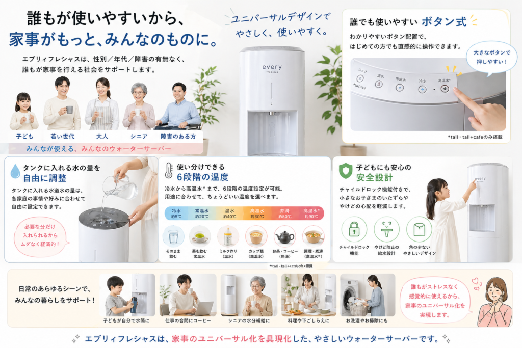 たかがウォーターサーバー、されどウォーターサーバー。「家事に追われる毎日」から、「自分の時間を持てる毎日」へ。エブリィフレシャスは、忙しい現代人のライフスタイルそのものを変えてくれる家電です。