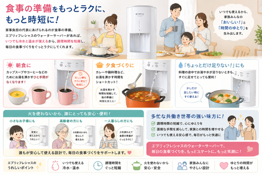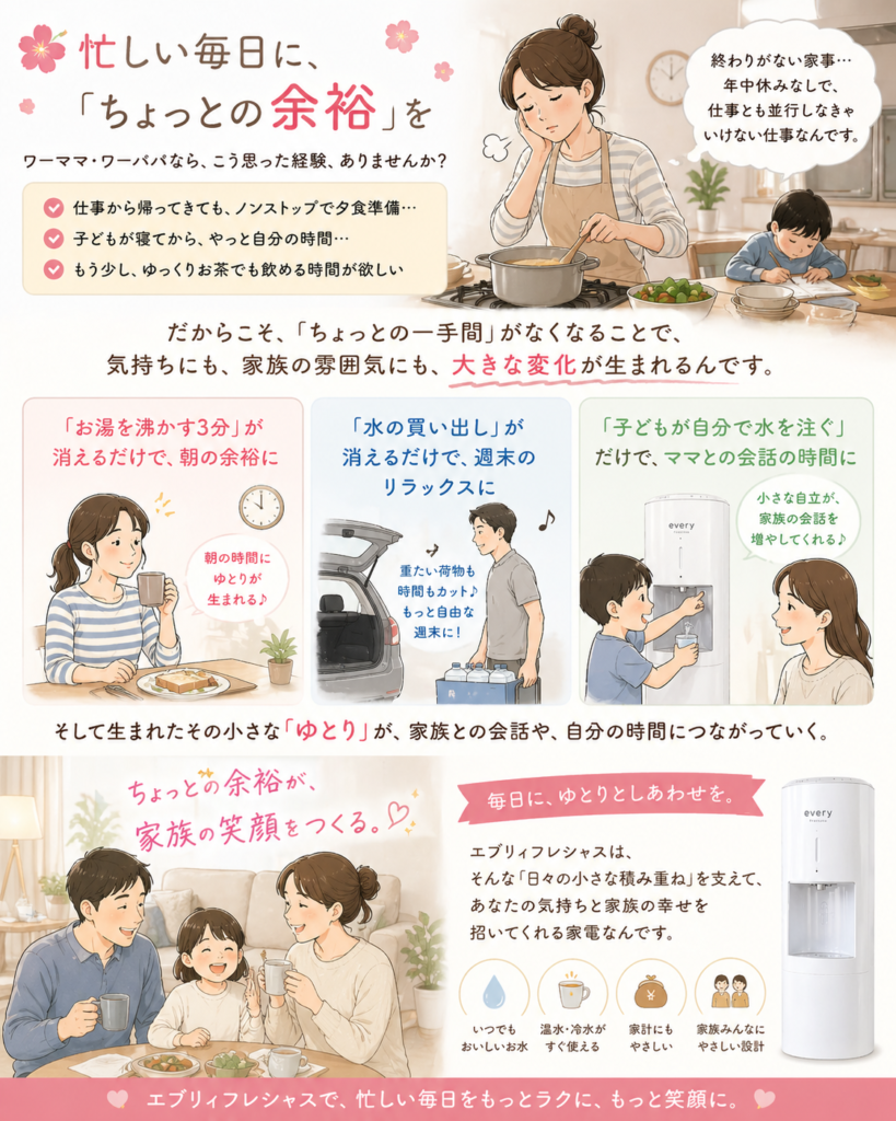そんな悩み、私も同じでした。でも、ある「家電」を変えただけで、毎日30分以上の時短に成功したんです。それが、浄水型ウォーターサーバー「エブリィフレシャス」でした。