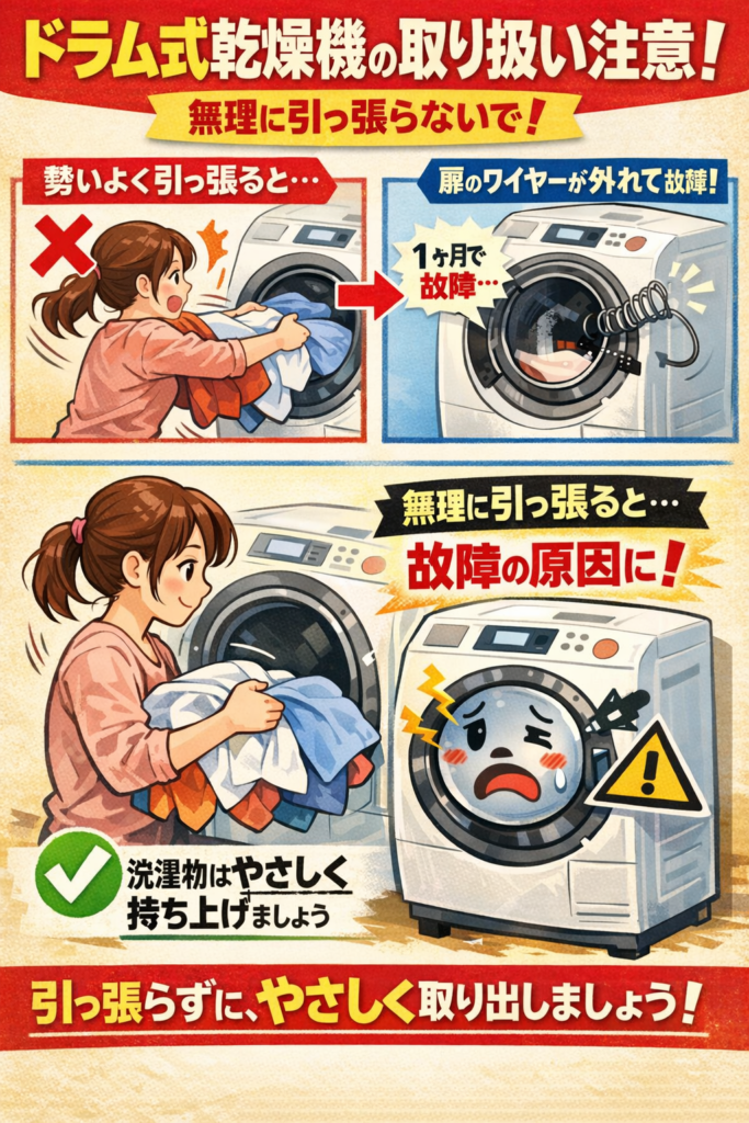 私は洗濯物を取り出す際、勢いよく引っ張るように出し入れをしていたため、ドラム式乾燥機の扉内部のワイヤーが外れてしまい、購入からわずか1か月で故障してしまいました。