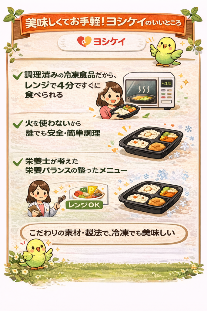 | 🥗 ヨシケイ | 献立いらず ミールキット | ★★★☆☆ コスパ良好 | 時短・手軽さ | ★★★★★ |