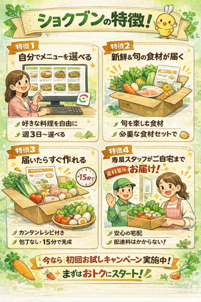 | 🍱 ショクブン | 惣菜・冷凍も 充実 | ★★★★☆ お手頃 | 品揃え・手軽さ | ★★★★☆ |