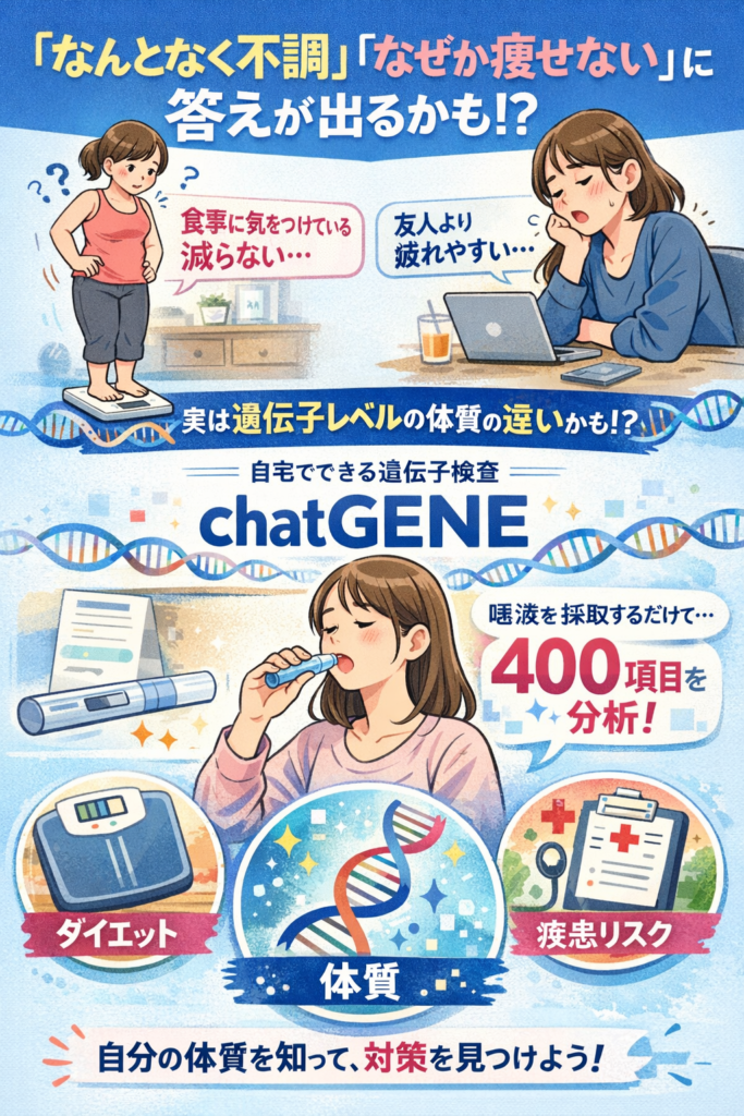 今回紹介するのは、自宅でできる遺伝子検査サービス**「chatGENE(チャットジーン)」**。唾液を採取するだけで400項目もの体質・疾患リスクがわかるサービスです。